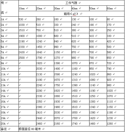 4.4 磁場強度:工作氣隙20mm時,80mm極頭中心磁場最大H≥2.2T